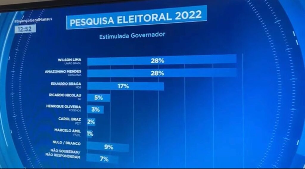 Na pesquisa, foram ouvidos 1.500 eleitores do Amazonas por telefone entre os dias 23 e 25 de julho. A margem de erro é de três pontos percentuais, para mais ou para menos, com um nível de confiança de 95%. O levantamento foi registrado no TSE sob o número AM-02872/2022.